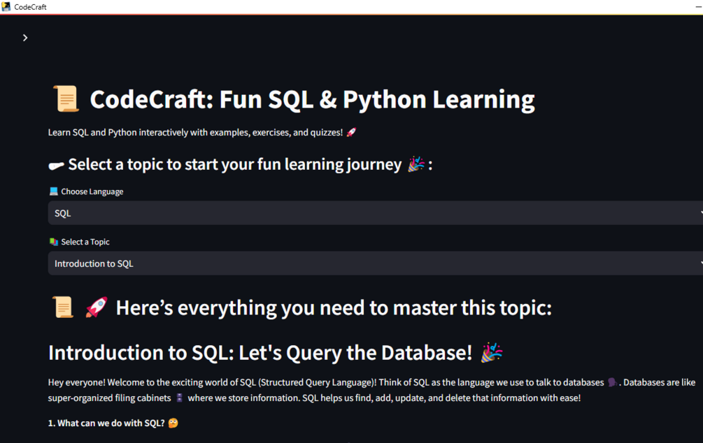 Provides a fun and interactive way to learn SQL. Offers engaging lessons and exercises for learning Python. Built using the Streamlit framework.